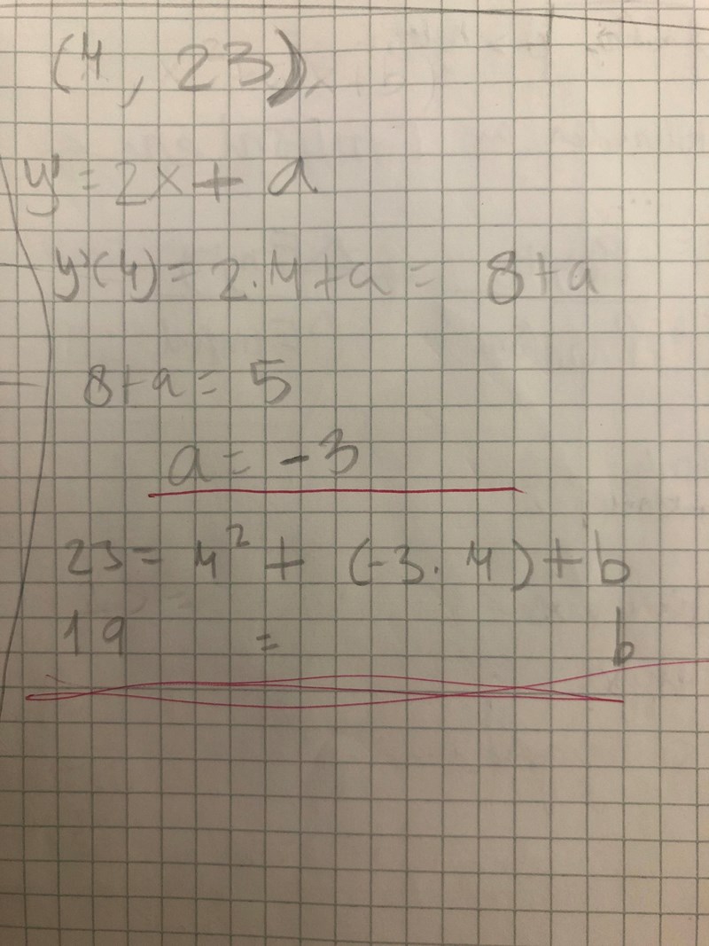 I den punkt på grafen till funktionen f(x) = x^2 + ax + b där x= 4 dras en tangent. Bestäm konstanterna a och b så att tangentens ekvation blir y= 5x + 3"