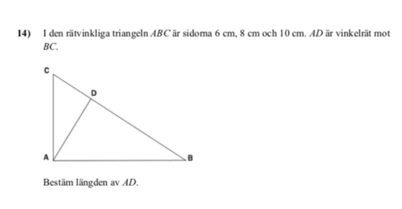 Jag tror att du har menat att använda likformighet. Det finns flera likformiga trianglar i figuren. Tycker du att triangel ACD är likformig med triangel ABC?