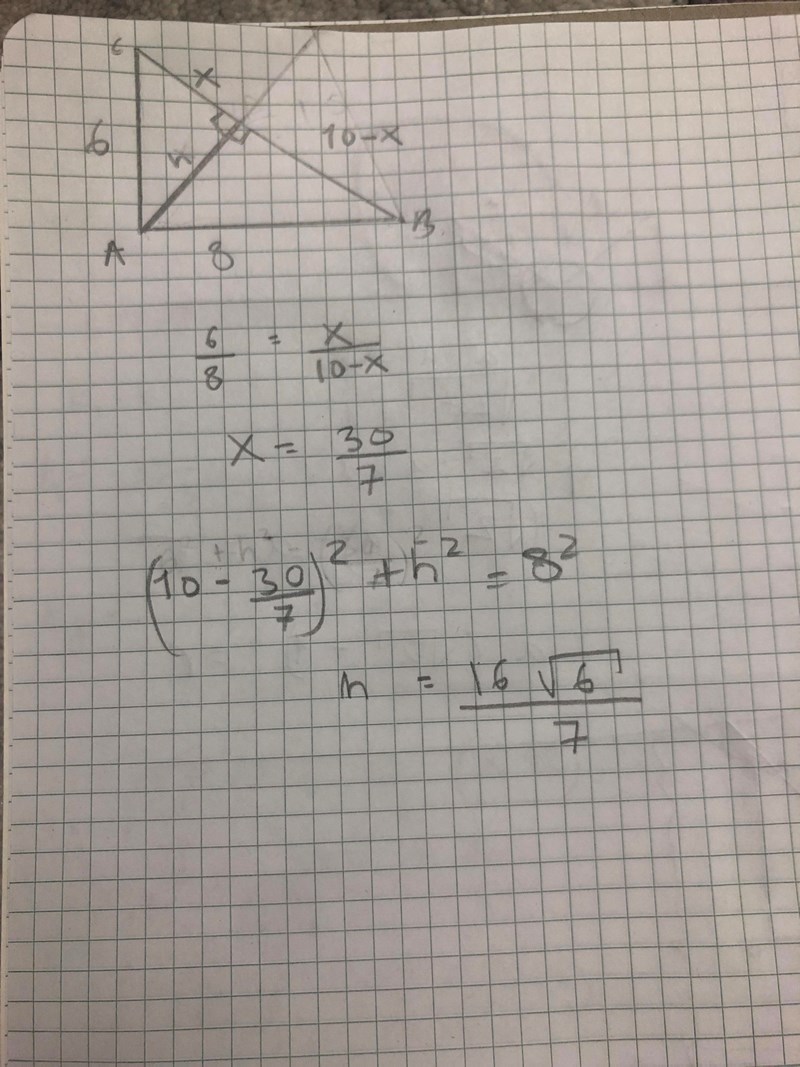 Jämför den triangeln med den stora ABC så ser du att du kan jämföra katetrar med varandra och då få fram längden av h