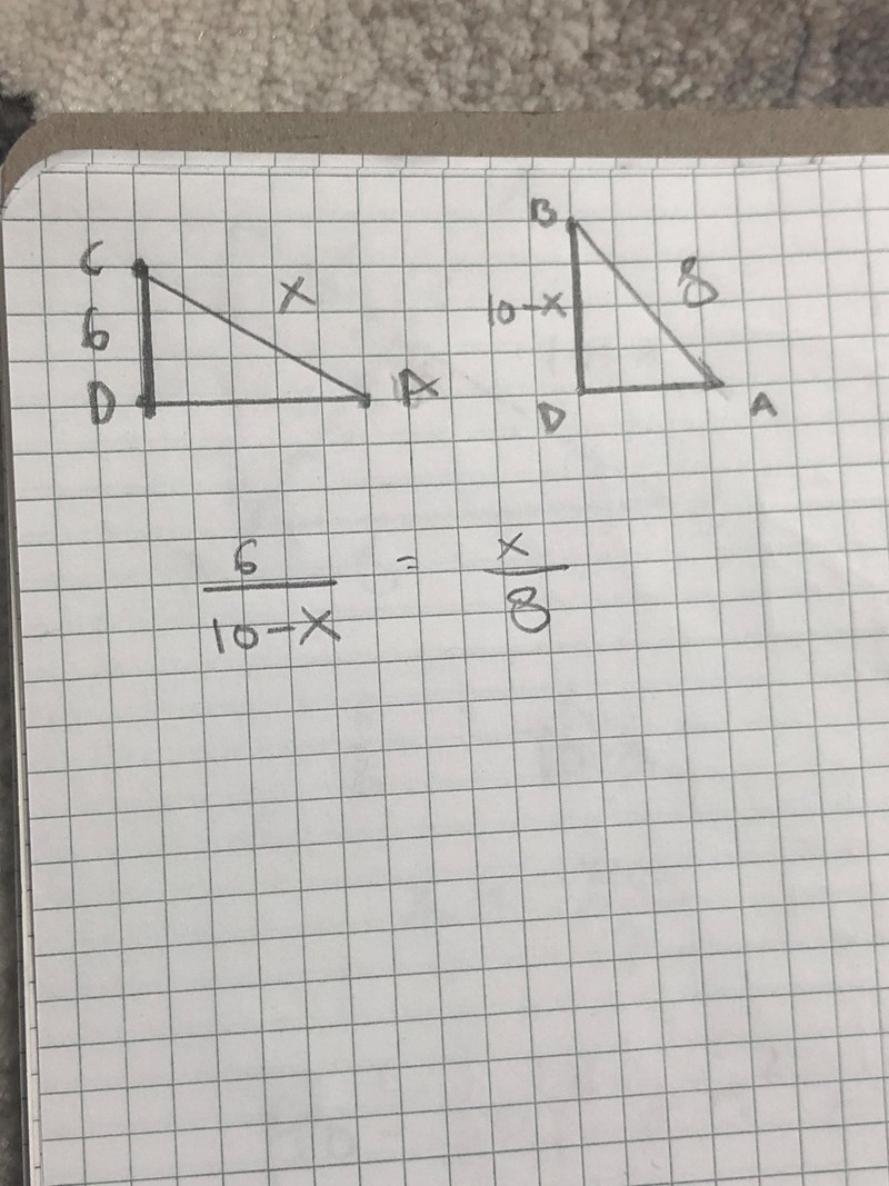 x och 10-x är inte två sidor i en triangel, så du kan inte använda likformighet med dem.