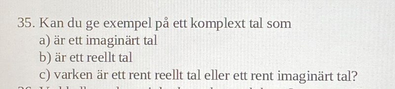 Ditt svar på a) som sagt är svaret på c, om ett imaginärt tal är och ett reellt tal är måste ett tal som inte är varken vara båda, dvs ett komplext tal med både en reell del och en imaginär del, exempelvis .