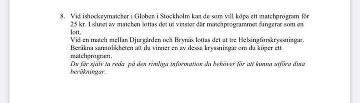 Men i frågan står inte hur många matchprogram som finns. Så avsikten är nog att skapa en generellt uttryck för sannolikheten att vinna. Då får man benämna antalet matchprogram med (förslagsvis) en bokstav, och så uttrycka sannolikheten i relation till beteckningen.