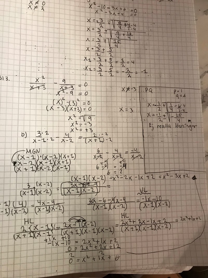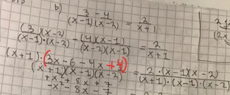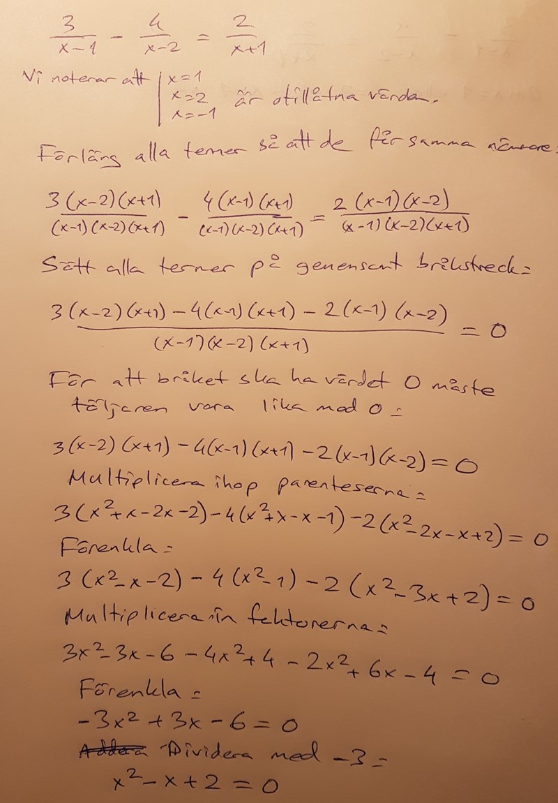 Om vi multiplicerar hela ekvationen med (x-1)(x-2)(x+1) så får vi 3(x-2)(x+1)-4(x-1)(x+1) = 2(x-1)(x-2) Multiplicera ihop parenteserna och förenkla. Vad får du?