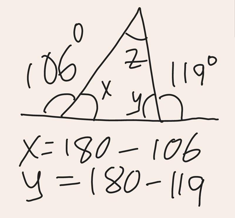 jag har glömt hur man gör här: en triangel abc har två yttervinklar 119 och 106, bestäm triangelns minsta vinkel