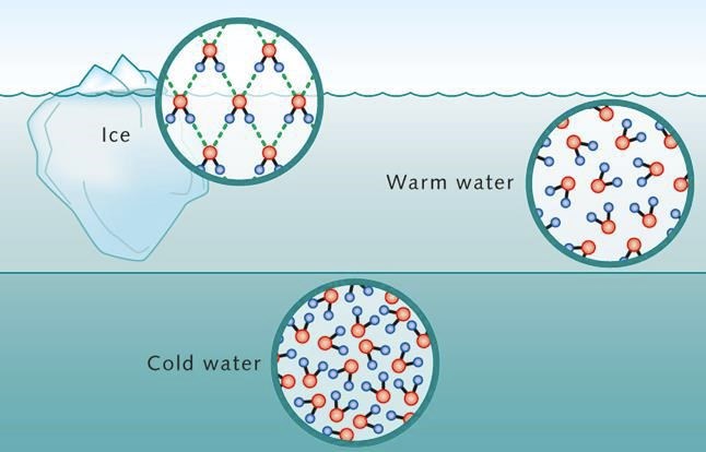 Molekylerna vill alltid binda till varandra som i isen, men när temperaturen är högre rör sig molekylerna så fort att de kan överkomma krafterna som vill binda ihop molekylerna.