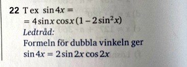 Jag har uppgiften ''Härled formleln för sin(4x), ''kvadrupla vinkel för sinus''. Anta att vi vet sin x och/eller cos x''. Jag bara skrev 2*sin2x*cos2x eftersom vi pratade om det typ igår... men faciten säger: