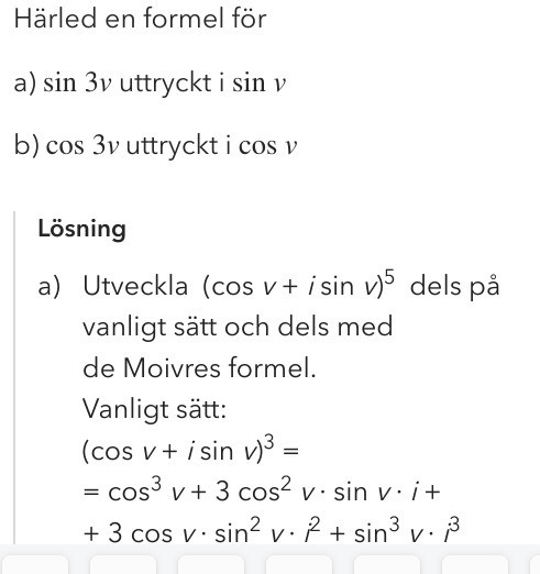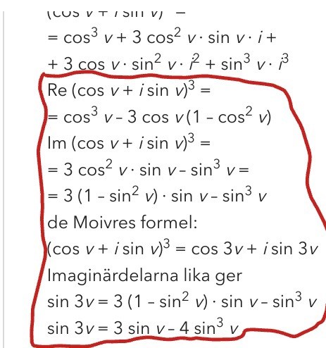De räknar ut detta i facit, och noterar att vi får i*sin(3v) i slutändan med de Moivres formel. Detta är vansinnigt likt sin(3v) som vi ville få fram ett uttryck för. Eftersom att i*sin(3v) även är imaginärdelen av uttrycket så borde det innebära att imaginärdelen av uttrycket är sin(3v) oavsett uträkningsmetod.