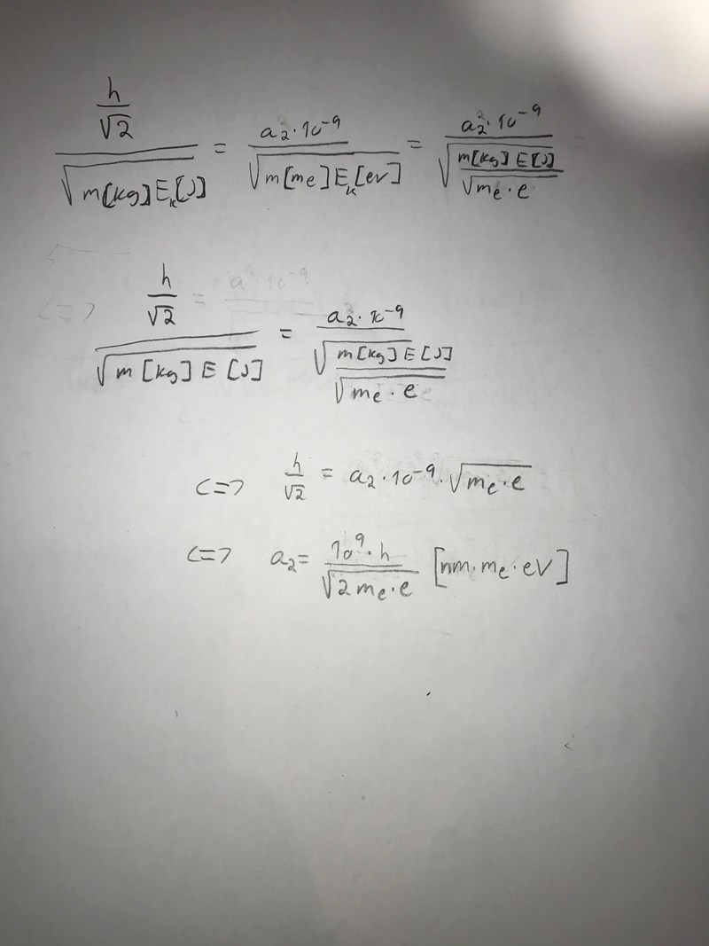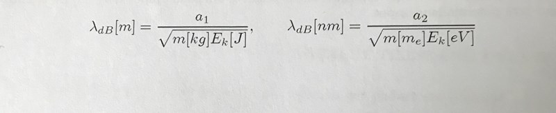 Härled två formler för hur de broglie-våglängden beror av den kinetiska energin Ek för en partikel med massan m. I den första formeln ska man kunna ange massan i kg och energin i J och få ut våglängden i m. I den andra formeln ska man istället kunna använda me och eV och få ut våglängden i nm. (me är elementarmassan för en elektron). Dessa formler kan uttryckas som (se bild):