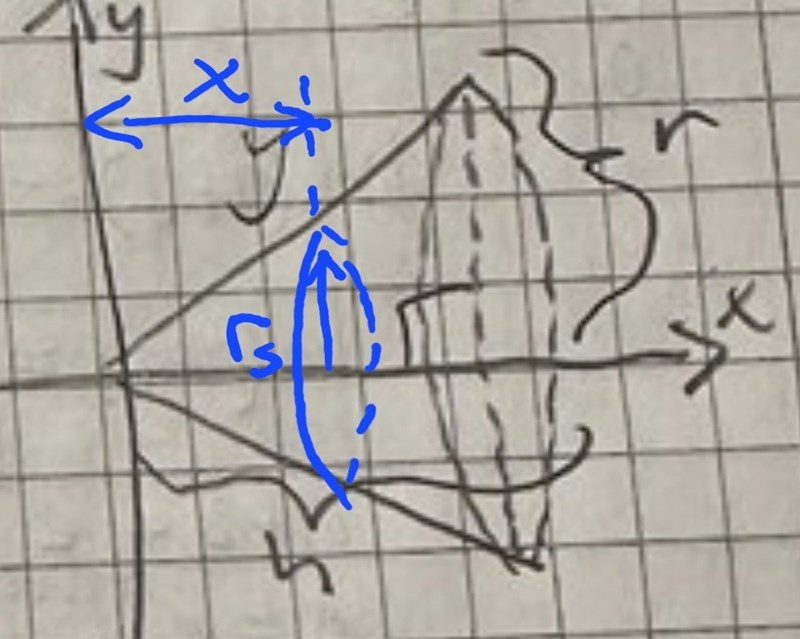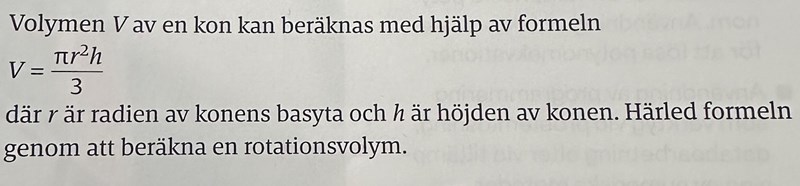 Kan du beskriva varför din integral ser ut som den gör, gärna med hjälp av en skiss över konen där du har satt ut relevanta storheter?