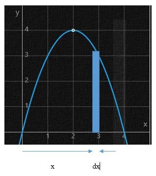 Du får alltså en remsa som i figuren, med höjden y och bredden dx. Avståndet till axeln är x, så att när remsan roteras runt axeln bildar den ett tunt cylinderskal med omkretsen 2πx, ytan 2πxy och volymen 2πxydx. Summerar man alla sådana skal inifrån och ut är det en integral från x = 0 till x = 4 av sådana volymer, vilket ger hela rotationskroppens volym.