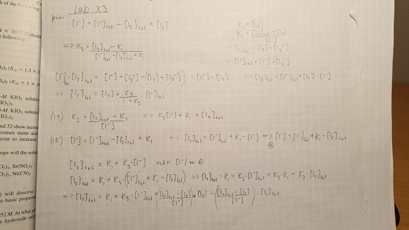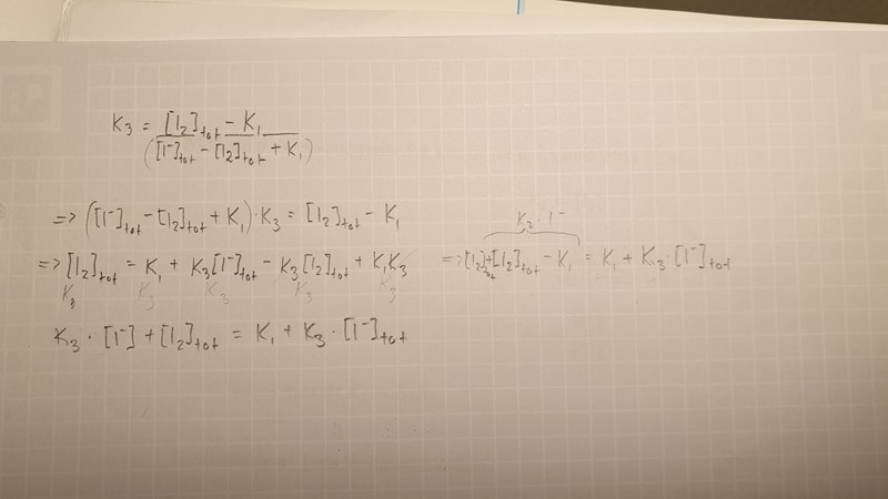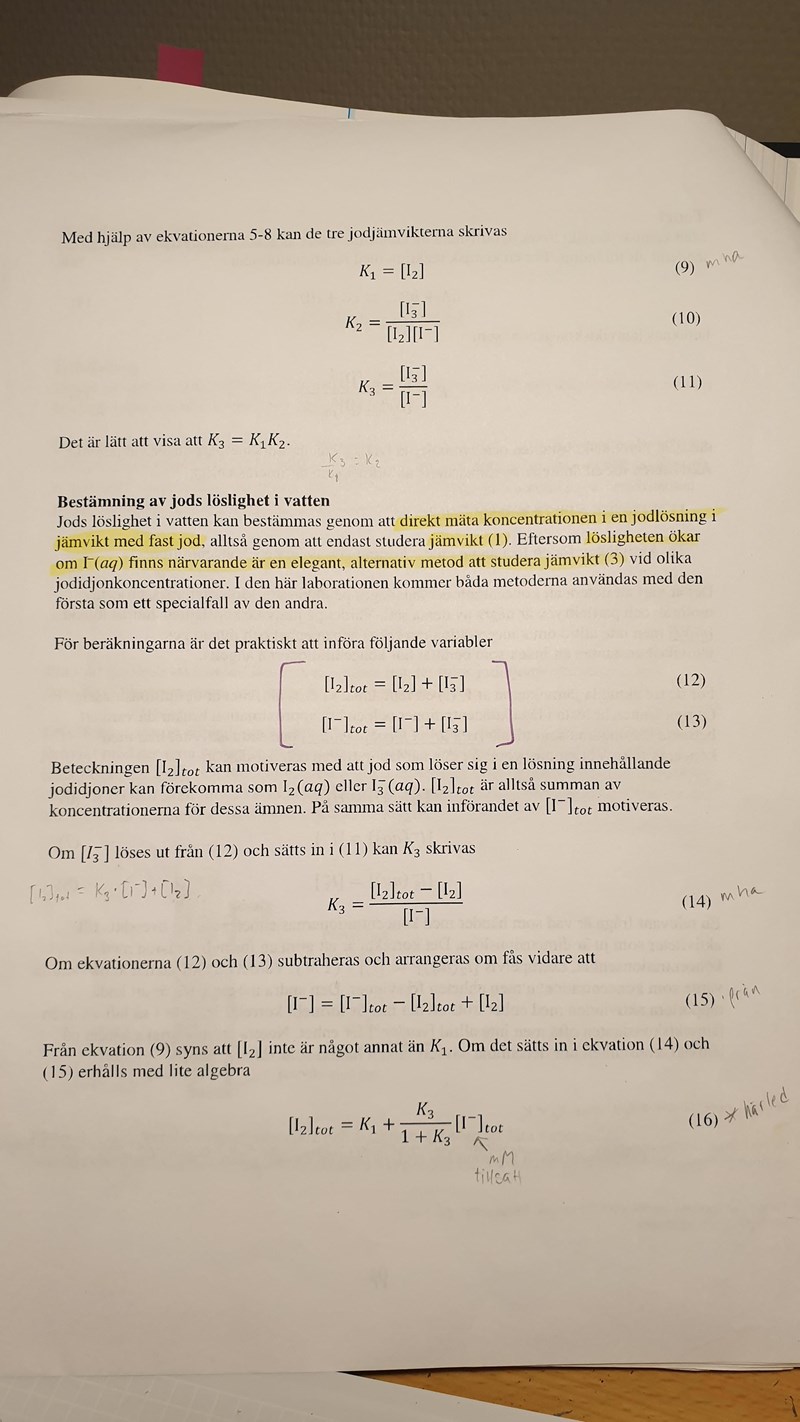 Om man sätter in detta i ekvation 15 och samtidigt byter ut [I2] mol K1 enligt ekvation 9 får man .