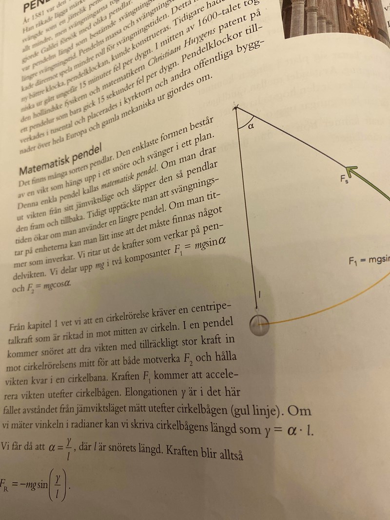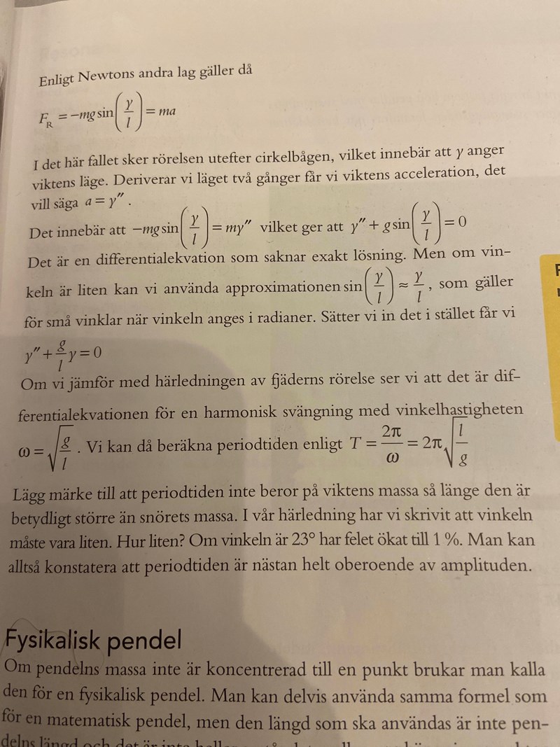 Det första jag inte förstår på första sidan är varför blir den resulterande kraften Fr=-mgsin(y/l)? Sedan det jag inte förstår på nästa sida är vad är anledningen till att y”+g/ly 0 saknar exakt lösning? Sedan i slutet står det att periodtiden är nästan helt oberoende av Amplituden vad står Amplituden för i en pendel?