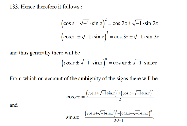 Jag har en fråga: Hur har Euler härlett formeln till de som visas nedan? Det står att det grundar sig på att tecknen är tvetydiga. Jag förstår att det innehåller både plus- och minustecken, men hur bestämde han vilken som skulle vara plus och vilken som skulle vara minus? Hur har han separerat cos.nz och sin.nz på det sättet?