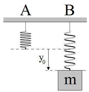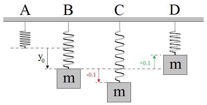 Alltså att kraften i fjädern i läge B är lika med tyngdkraften. Vi får fjäderkonstanten från: