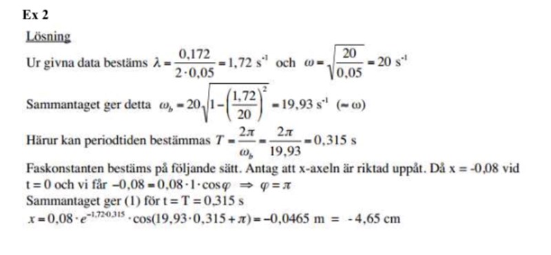 Vad för något är faskonstanten? Varför står det 0,08*1*cos(fi)? Borde det inte stå vinkelhastigheten*tiden? Vad beskriver x som räknas ut? Varför multipliceras det med e^(-1,72*0,315), förstår inte hela sista raden.