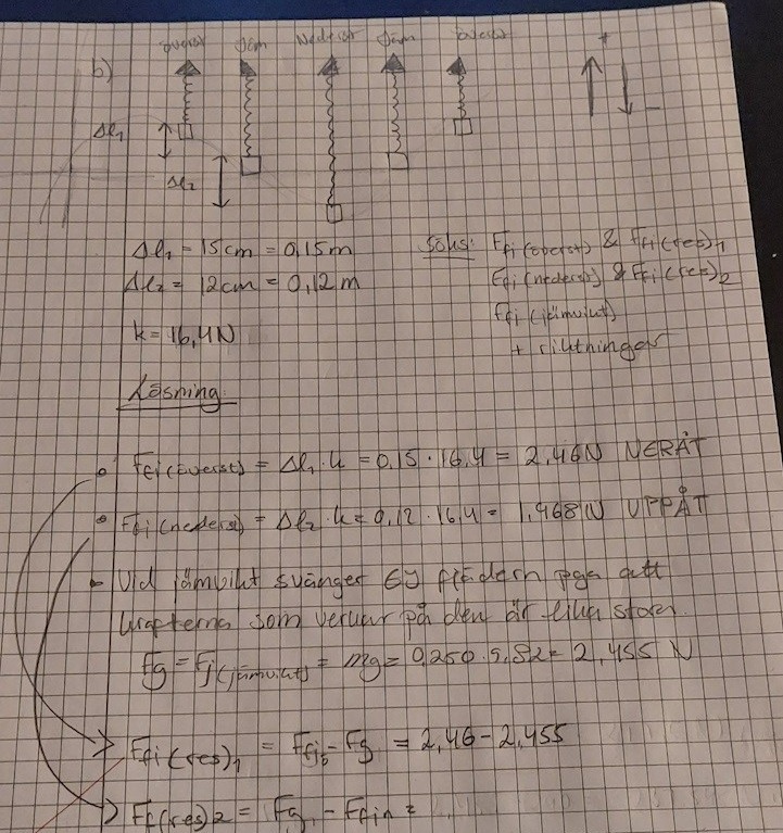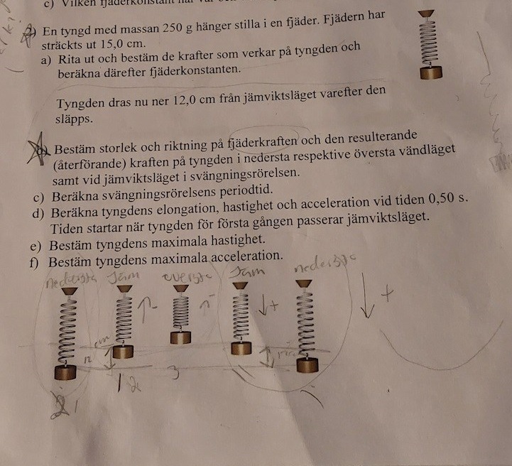 I nedersta läget verkar alltså mg nedåt på tyngden och fjäderkraften drar uppåt med (0,15+0,12)*k,