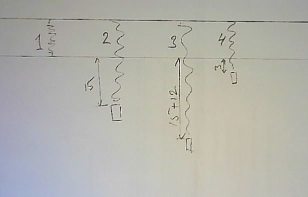 Är inte förlängningen 15 cm i jämvikt pga att vi har hängt en vikt i den? Och därefter dras tyngden ner 12 cm vilket motsvarar förlängning nr 2?