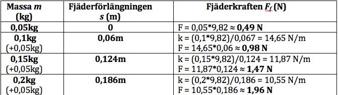 Du ska beräkna fjäderkonstanten "k" enligt: