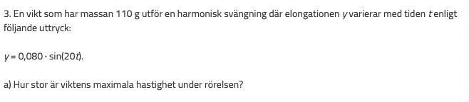 En vikt som har massan 110 g utför en harmonisk svängning där elongationen y varierar med tiden t enligt följande uttryck:
