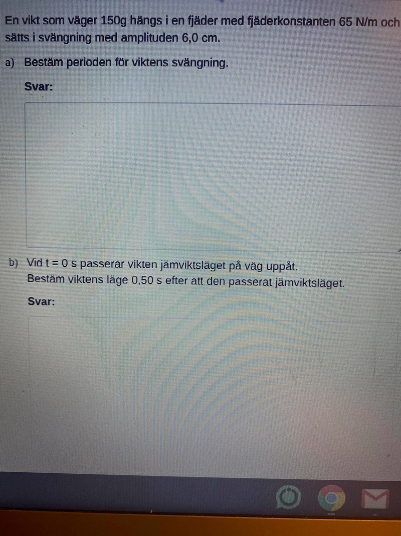 eli321be, det står i Pluggakutens regler att du skall ge dina trådar rubriker som gör att det är lätt att skilja mellan dem - det underlättar för oss som svarar. Nu har du gjort två 4 trådar som heter harmonisk svängning - rätta till det, så att de blir olika! Du kan t ex lägga till några ord på slutet som skiljer dem åt. Du kan själv ändra rubrikerna genom att redigera ditt förstainlägg (inom 2 tillar, därefter måste du be en moderator om hjälp). /moderator