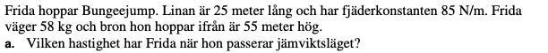 Du behöver använda dig av fjäderkonstanten för att beräkna jämviktsläget (där Frida hamnar om man väntar tillräckligt länge, eller så lång linan skulle bli om man hängde en 58-kg-vikt i den).