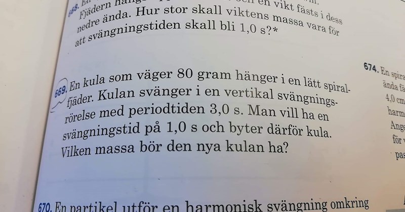 (Det blir tveksamt om man kan försumma fjäderns massa då, men detta är ju en tillkrystad skoluppgift.)