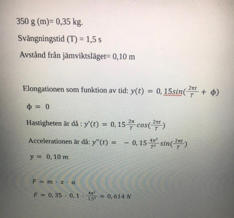 Strunta i fjäderkonstanten k, du behöver inte den. Hur ser funktionen för elongationen ut, om amplituden är 0,15 m och svängningstiden är 1,5 sekunder?