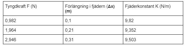 (En 100g vikt fästes i fjädern, sedan en 200g vikt och sist en 300g vikt). Tror inte jag har gjort något fel här).