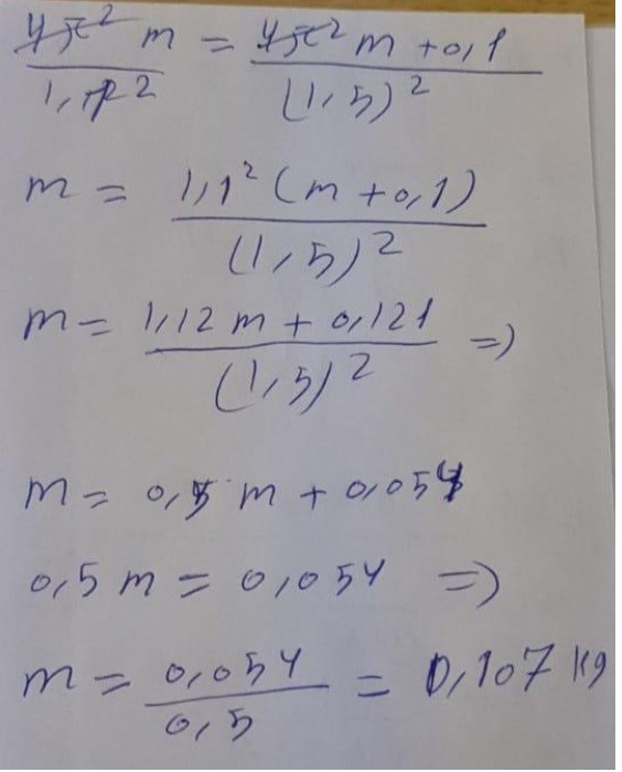 Då vet du att om man sätter in att massan är m och att tiden är 1,1 s så har uttrycket värdet k, och om massan är m+0,1 och tiden är 1,5 så har också uttrycket värdet k. Kan du få fram en ekvation från detta?