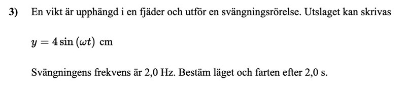 Jag tänkte att jag skulle räkna ut ω och hittade formeln ω=sqrt(k/m) men jag har ju varken k eller m så fastnade där. Finns det något annat sätt att räkna ut ω på?