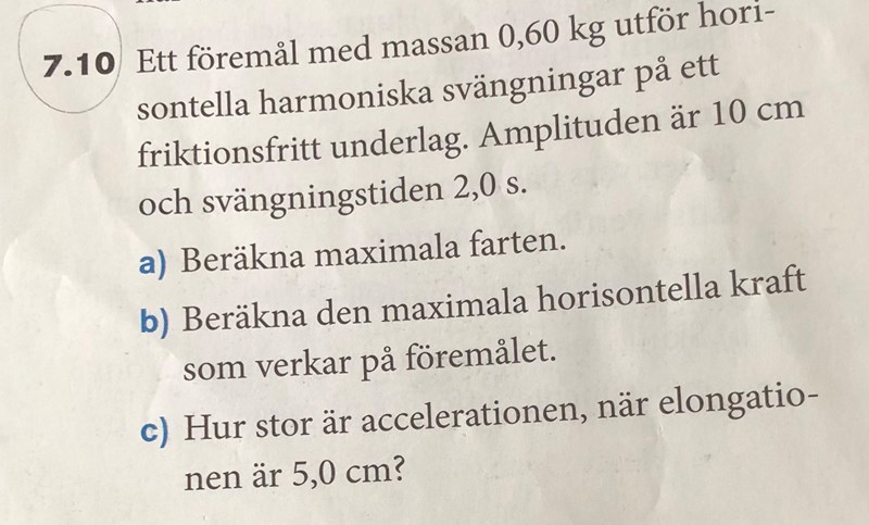 I din alternativa uträkning så antog du att rörelsen beskrevs av , där är avvikelsen (positiv eller negativ) från jämviktsläget, och man får automatiskt ett som har motsatt tecken mot