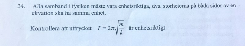 Du behöver visa att det som står under rotmärket har enheten s^2 för att vänster- och högerledet ska få samma enhet. Använd det du säger att du vet.