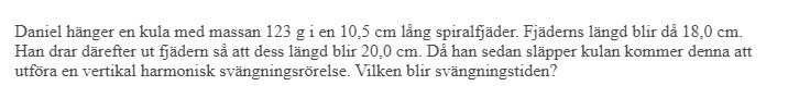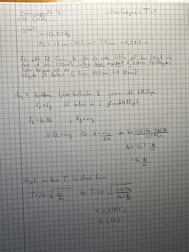 "Du tänkte helt rätt med Ff = Fg men du använde fel längdskillnad. För att få fram k ska du inte titta på hur långt du drar ut den (20 cm), utan hur mycket fjädern förlängdes från början när du hängde på kulan (från 10,5 cm till 18,0 cm)."