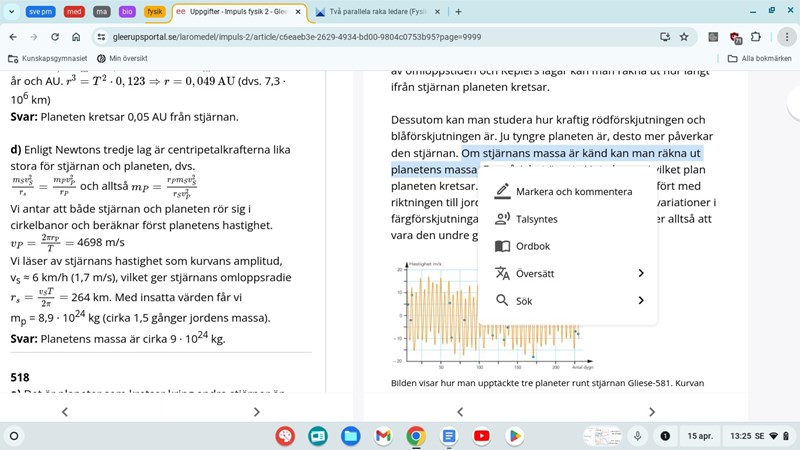 Hej, det som jag markerat med blå, är det vad som illustreras i lösningen i d-uppgiften? dvs är det så de menar att vi ska göra för att ta reda på planetens massa? är stjärnans massa (ms) då lika med 0,123* (1,989*10^30)