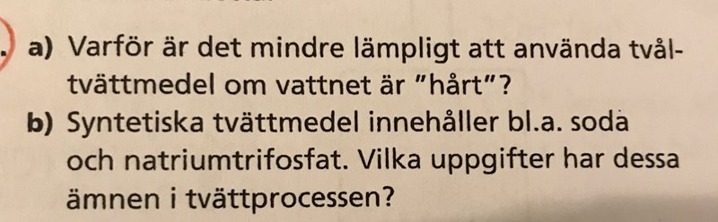 I Wikipediaartikeln om hårt vatten finns svaret på fråga a. Den andra frågan får du svar på i Wikipediaartikeln om tvättmedel.