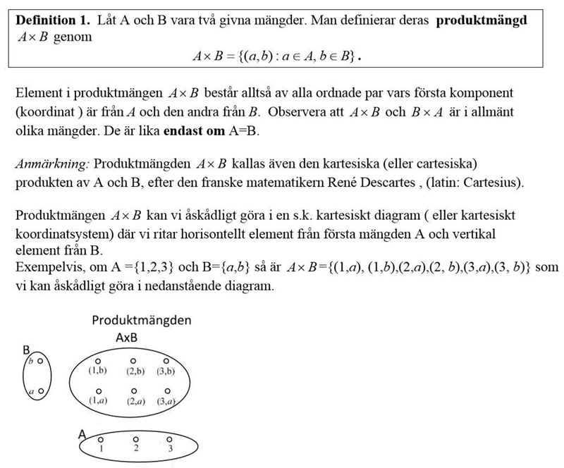 "Låt och och relationen från till är . Bestäm definitionsmängden, värdemängden, matris och rita en riktad graf (Hassediagram)."