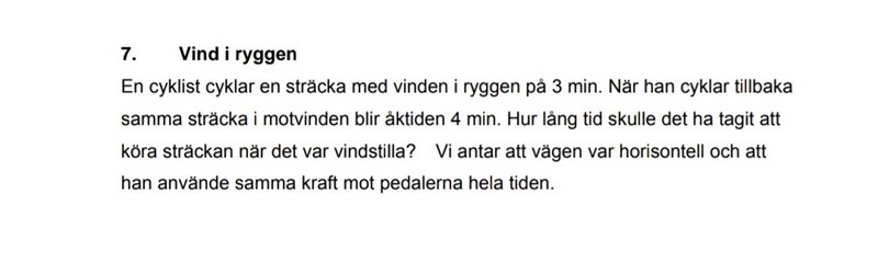 Jag har för mig att man kan ta (hastigheten i motvind+hastigheten i medvind)/(2) för att få fram hastigheten han cyklar i. Då borde man få (3+4)/2 = 3.5. Men i facit står det att det tar 3,(3/7) min. Vad gör jag för fel?