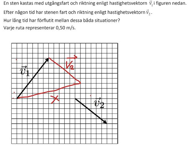 Hur mycket har hastigheten ändrats från v1 till v2? Du ser att den fortfarande är riktad åt höger, så ändringen i x-led verkar vara liten. I y-led har den ändrats från ganska mycket uppåt till ganska mycket neråt, alltså en stor ändring neråt.