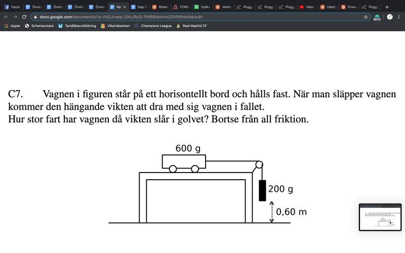 Hur stor fart har vagnen då vikten slår i golvet? Bortse från all friktion.