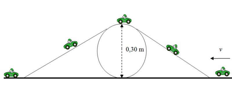 En liten leksaksbil med små och lätta hjul rullar med hastigheten v mot en uppförsbacke som har höjden 0,30 m. Längst upp är backen cirkelformad och därefter kommer en nedförsbacke. Mellan vilka gränser ska hastigheten v ligga (dvs hastigheten innan bilen börjar rulla upp för backen) om bilen ska kunna passera backarna och ha full kontakt med underlaget hela vägen? Man kan bortse från luftmotstånd och bromsande friktion.