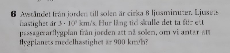 Steg 1: Beräkna avståndet till solen. Använd då att du känner till ljushastigheten och att 8 "ljusminuter" är den sträcka som ljuset hinner på 8 minuter.
