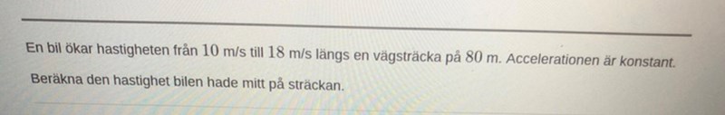 De frågar efter bilens hastighet då den har kört halva sträckan, dvs då den har kört 40 meter.