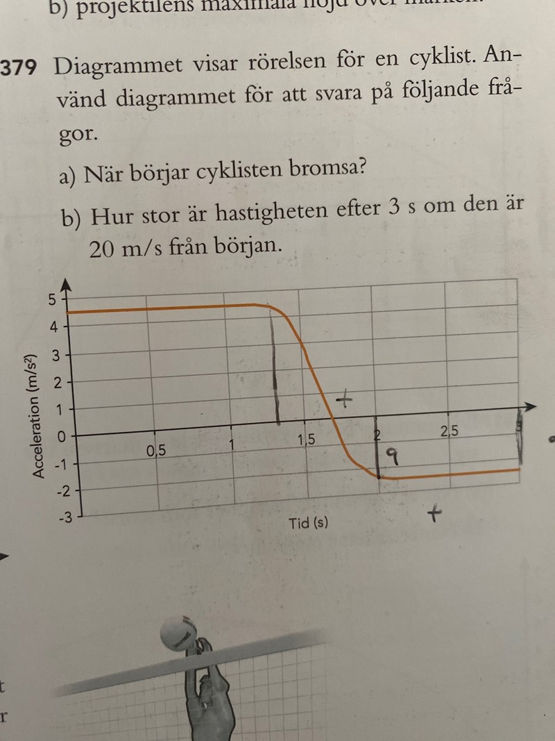 Hej! Har fastnat på fråga b, i facit står det att man ska kolla på arean under grafen som är hastighetsändringen men får rektangelns area till (3-2)(-2,5)=-2,5