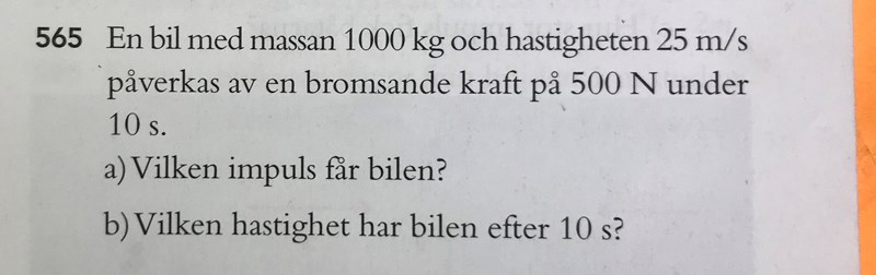 i denna uppgift (b uppgiften) får jag svaret 25 m/s men det ska vara 20 m/s och jag tänkte att rörelsemängden innan hastigheten börjar minska är (1000*25) och sedan minskar den rörelsemängden med 5000 kg *m/s (enligt svaret i a) därefter tog jag 25000-5000 vilket blir -25000 och det ska i sin tur vara rörelsemängden och då kan man ställa upp ekvationen (-2500=m*v) och följaktligen få ut att v är 25 m/s men jag vet inte vad som blivit fel! Tack på förhand