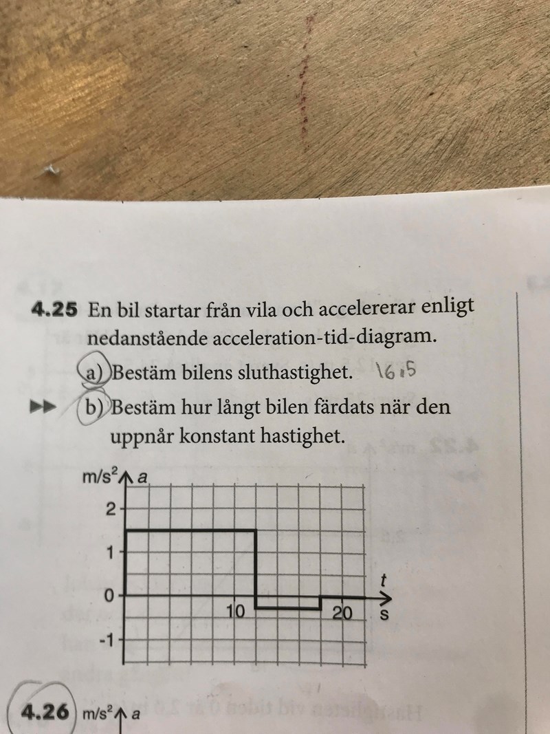 Hastigheten beräknas som arean under en at-graf. Sträckan beräknas som arean under en st-graf (integralen) pga v=a*t och s=v*t. Kommer du vidare då?