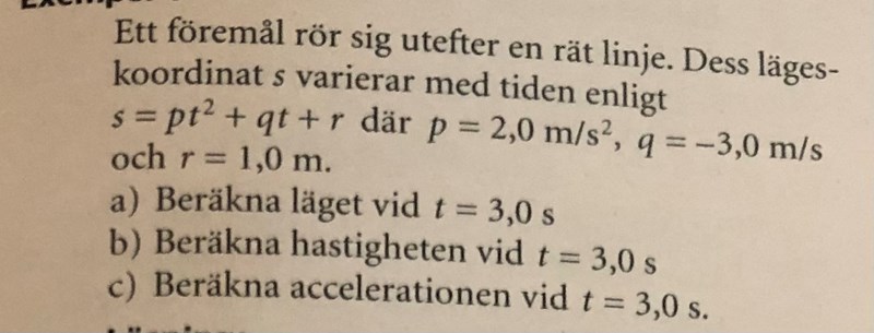 Jag tänkte använda v=stoch s blir då den ekvationen i frågan. Men facit säger 2pt + q = (2*2,0*3,0-3,0) = 9,0 m/s