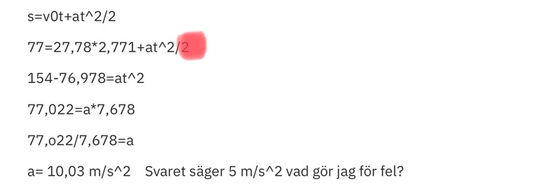 På min uträkning flyttade jag över /2 i at^2/2 till andra sidan likhetstecknet och multiplicerade 77 med 2 så att det blev 154 och därför försvann två:an. Varför kan man inte räkna ut uppgiften så?