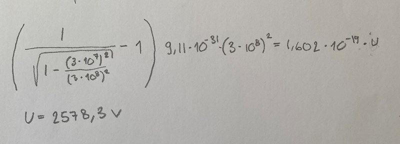Smaragdalena skrev:emmysjob skrev:En fråga lyder "Hur stor spänning behövs för att accelerera en elektron från hastigheten 3*10^6 m/s till hastigheten 3*10^7 m/s?"