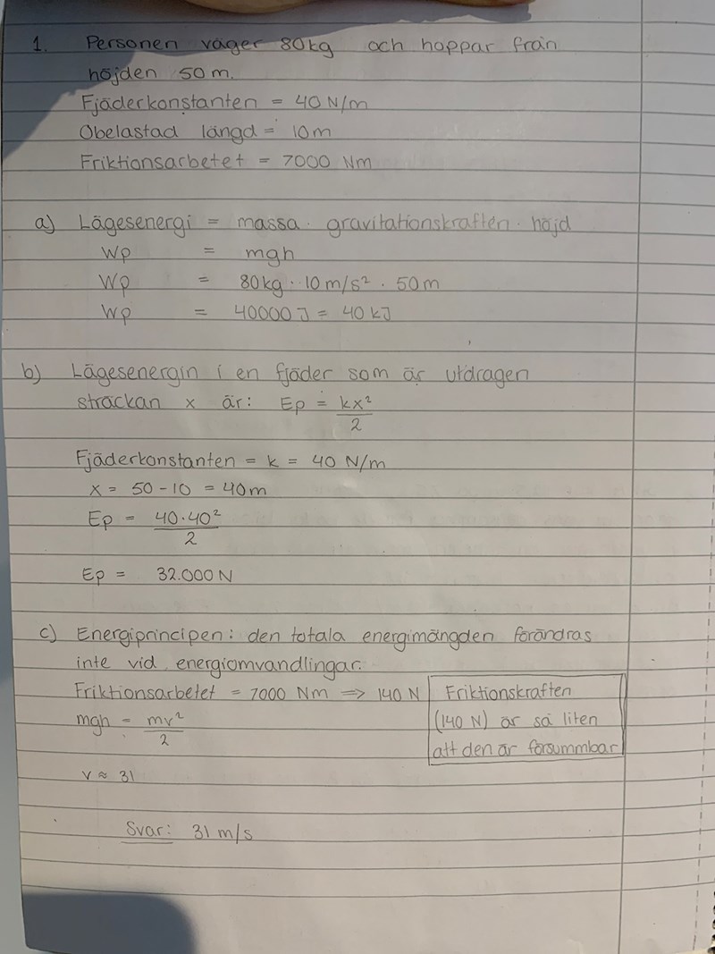 En person (80kg) hoppar bungyjump från höjden 50m över vatten. Den elastiska linan kan betraktas som en fjäder med fjäderkonstanten 40N/m och obelastad längd l0= 10m. Friktionsarbetet i form av luftmotstånd, är 7000 Nm.