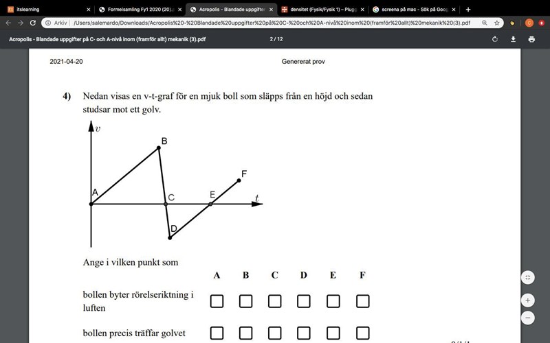 på första frågan: bollen byter väl sin riktning när hastigheten har sitt tecken ändrat från + till - eller- till +, så varför kan är punkt E svaret på första och inte punkt D?